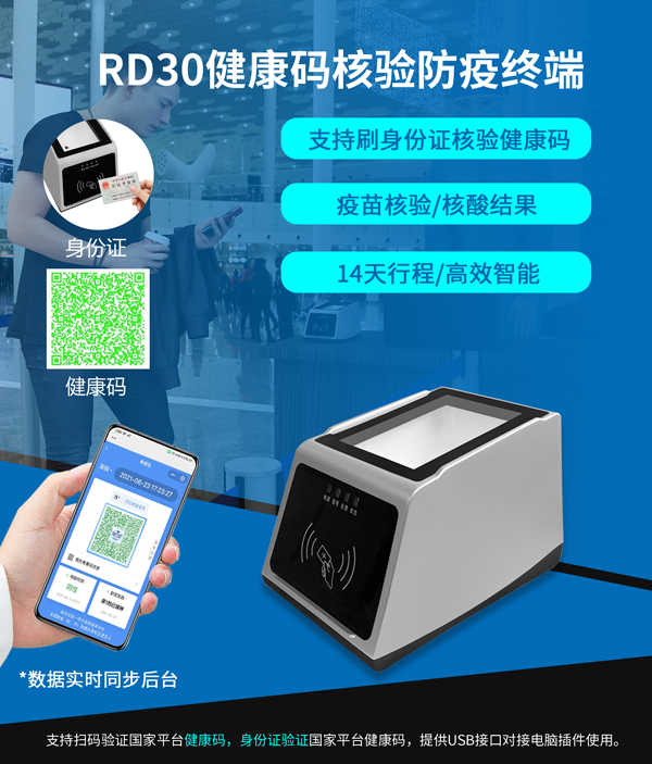 经过了解,健康码扫码核验平台(RD30)是深圳市远景达物联网技术有限公司应“健康码核验”的迫切需求和远景规划研发的桌面式健康码核验终端,一般通过USB接口对接电脑插件使用,它的外观类似于超市收银专用二维码扫描平台。而通过扫码+身份证调用检测健康码后,实时的健康码状态、14天行程及核酸检测结果等防疫风险信息就可以很直观地在电脑屏幕上显示,检测数据实时传输省卫健委数据库,能够自动统计各类“健康码”核验情况,让人员可以更直观地感受、切身体验到智能化手段带来的便利。