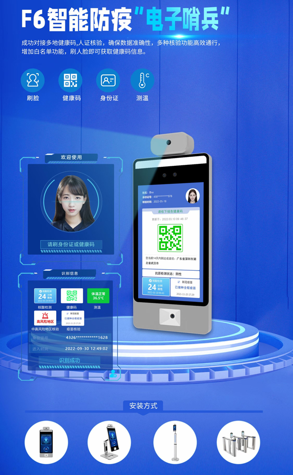 针对防疫需求,四川省成都市在常态化疫情防控期间上线使用了健康码测温仪、“电子哨兵”等人脸核验终端设备,在“物防+人防”基础上,全面提升“技防”水平,多维度筑牢疫情防控“安全墙”。接下来,我们不妨了解一下四川地区使用的防疫健康码设备——“电子哨兵”,集测温核验健康码一体化功能的软硬件系统,通过读取身份证或扫描天府健康通,即能快速识别被检对象的体温、健康码、核酸检测和疫苗接种等信息。