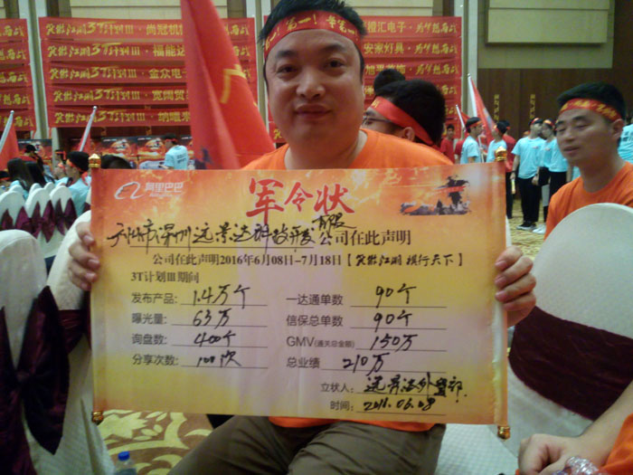 参与3T计划的深圳远景达负责人表示,在启动仪式上,各“军团”受“军旗”、签“军令状”,各参赛企业依次上台报销售目标、表决心。“为了突破外贸销售瓶颈,此次我们公司将在3T计划40天中冲刺210万销售额。”上述企业家说。
