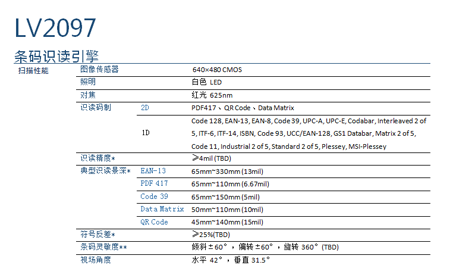 LV2097条码识别模块(二维码扫描模组),采用CMOS影像技术以及国际领先水平的远景达二维条码智能图形识别系统,具有卓越的条码扫描和数字图像采集功能,实现了加长景深和快速条码读取,并增强了低质量条码的识读性能,同时对于高反光表面上的条码(如手机二维码)也具有强劲的解读能力。从高密度一维条码到移动设备屏幕上的二维条码,LV2097都能轻松读取。超薄轻巧机身,全新的高密度设计和可靠性设计,将内部关键部件都集中安装在一个固定模组上,适合PDA产品、POS设备、平板设备、手持终端、其他轻薄型设备和扫码枪等设备集成。