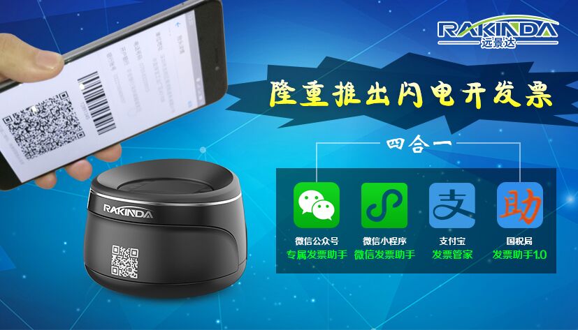其实现在市面上有更加方便商家的方案,不仅在支付宝上生成二维码才能识别,而是微信小程序、微信公众号、国税局开票助手1.0生成的二维码都能识别,商家只需要准备一台远景达(RAKINDA)RD4100四合一闪电开票助手,在前台放一台,顾客在手机里输入号信息生成二维码,在RD4100的扫描平台上识别一下,便可以开票成功!RD4100的价格还非常实惠,有兴趣的老板请电话联系远景达。