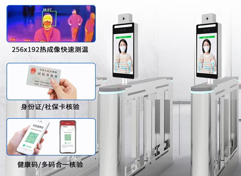 集刷脸识别、身份证健康码核验、体温检测多合一功能,可联动门禁或道闸开门操作,以实现健康码的自助查验、升级卡点现场管理能力和自动化数据汇总与分析,非常适合中高端应用领域,如医院、会展、市政务服务大厅、交通场馆、检疫检验站等公共场所。
