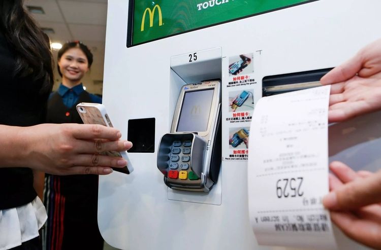 如今去麦当劳点餐只需要在自助点餐机挑选你要的东西,再打开手机的移动支付软件生成支付二维码,把二维码放在自助点餐机上的二维码识别扫描器上,可以快速买单。
