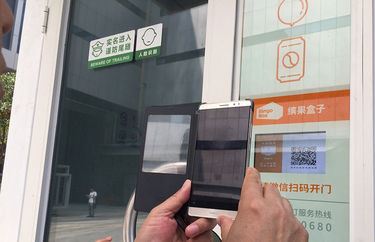 (1)从门外可以看到无人超市设置了两个门,首次到店需要打开微信扫描门外贴着的二维码,并关注其公众微信号,输入个人信息并注册,扫码成功后根据提示音,门打开在2秒内进入即可;