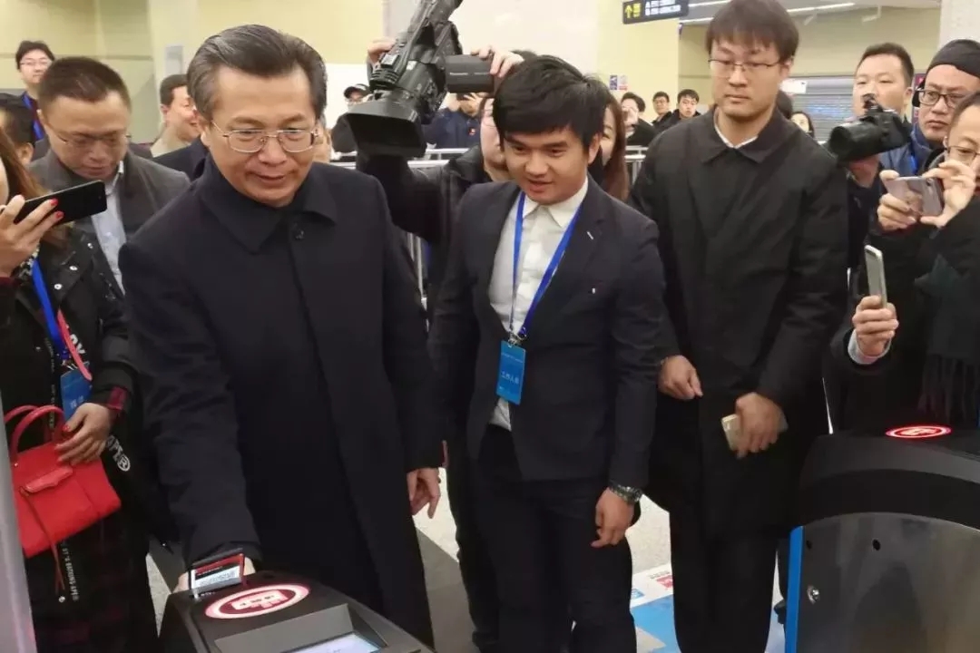 2018年1月1日起,西安地铁扫码过闸全线开通试运行!省委常委、西安市委书记王永康、市长上官吉庆与市民代表共同体验坐地铁用手机扫码过闸的快捷与便利。