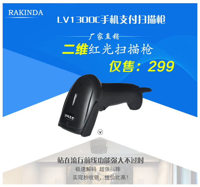 在此,深圳远景达推荐GS1300,是一款通用的精巧尺寸的手枪型扫描枪,采用线形图像解码技术;外型也安装了很多人性化操作,超大触发按键,让使用者更容易操作;读取速度可以达到400秒/次,景深500mm!可解一维条形码和Gs1 DataBar条形码。