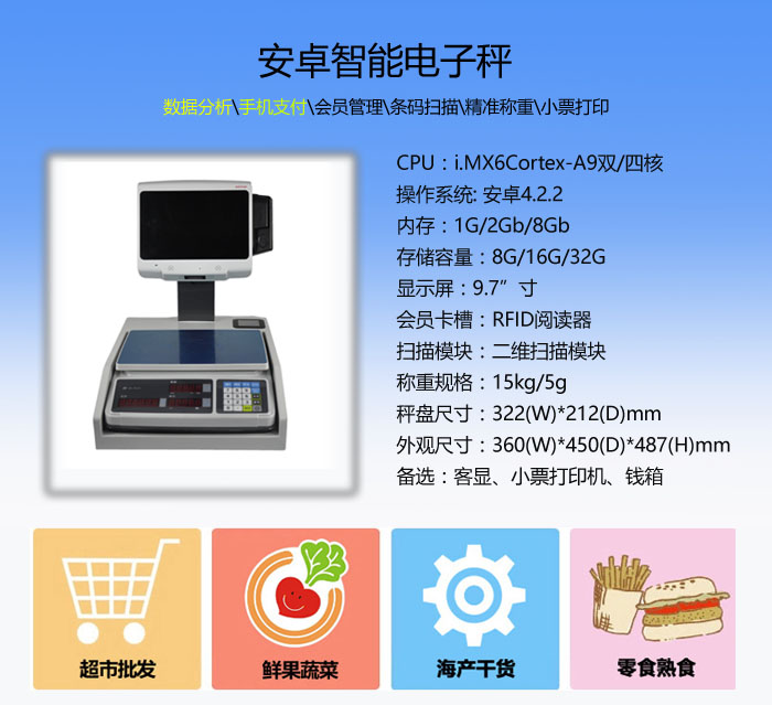 从上面的案例我们可以看出,一款优秀实用的智能电子秤才能为市民和商家带来良好的体验和管理方式。所以笔者推荐深圳远景达安卓智能电子秤,一款管理和收银集于一身的一体机;内嵌有扫描模组,支持支付宝微信付款;自带物联网RFID终端模块,可以读取RFID会员卡,高频和超高频都可以;精准称重,结合软件系统功能,实现自动校准;多种外接口设计,有需要的还可以配置打印机,满足客户不同需求,灵活扩展和选择;适用于水果店,零食店,菜市场,生鲜门店等。