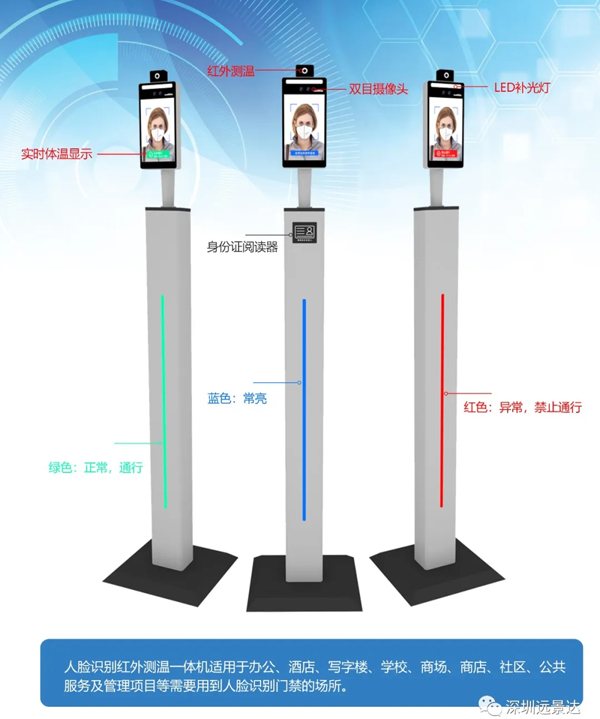 综上,新冠疫情突发至今,疫情防控工作面临着巨大的压力,人们在面临传染性疾病的防护意识也逐步提高,目前及未来都需要各种各样的防护措施来应对流感、肺炎和呼吸道感染等易通过空气、飞沫和接触等方式传播的传染性疾病。这种部署简单、适用于各种公共场合的立柱式刷脸测温一体机,不仅能够做到平时防护、灾时应急,而且能为疫情防控与功能卫生应急管理体系建设提供新思路、新途径,极大提高了疫情防控工作的安全性和效率,也保障了人们的生命安全。