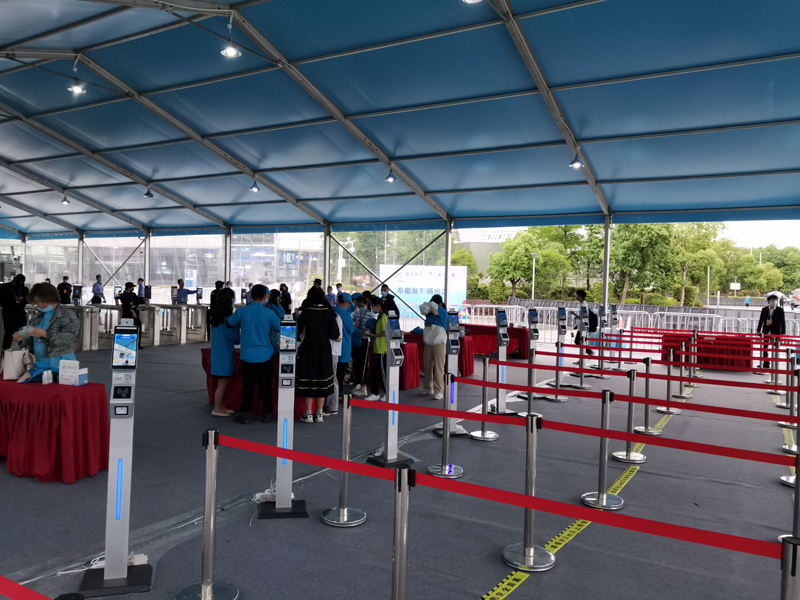 峰会场馆每个入场口都有人脸测温设备(健康码通行款),与省疾控中心数据共享,刷身份证或健康码实时上传数据平台,自动核验反馈结果,所以完成自助验证的时间都很快。一旦设备报高温或健康码异常,工作人员会迅速进行二次核实,并将引导至隔离区进行观察,切实排除一切隐患,把峰会的疫情防控工作做细、做实、做到位。南大门主路口某嘉宾进入场馆时表示,“如此全面专业的数字防疫技术还是首次亮相在数字峰会上,刷身份证或健康码验码通行,整个流程都非常快,所有的防疫保障措施都做得非常好。”