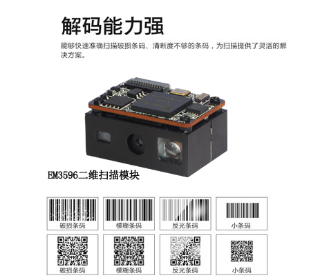 EM3596新大陆二维扫描模块是一款专为各类手持设备OEM个性化定制的嵌入式、可二次开发的二维码读取设备,即条码扫描模块,很多品牌手持机都需要读取条码、二维码的功能,那么将它集成嵌入则可以实现此类功能。3596扫描模块采用的是第六代核心解码技术,使用最新的1280*800高清影像感测器,搭配激光十字对焦,户外阳光下依然清晰可见,确保准确的扫描条码,加以解码板和摄像头一体化高集成度设计,体积减小到极致,可满足各类小型化应用的需求,适合PDA设备配套、平板设备配套、轻薄型设备配套、传统自助设备配套、条码枪等设备集成。