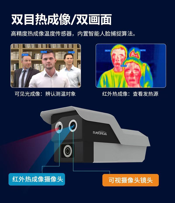 针对热成像多人体温快速筛查的需求,深圳远景达(RAKINDA)自主研发生产的热成像多人体温快速筛查仪(即天眼1.0测温系统),充分发挥出物联网、大数据和AI人脸识别等信息化技术优势,只要通过检测设备,无需停留,大显示屏会实时显示被检测人员的体温,秒速呈现体温初筛结果,当有人员的体温过高超过告警温度阀值时会有警报播报。