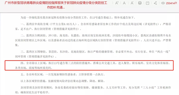 根据《广州市新型冠状病毒肺炎疫情防控指挥部关于新冠肺炎疫情分级分类防控工作的补充通告(第15号)》相关要求,通告明确:“搭乘公共交通工具,进入餐饮、娱乐场所、室内文化体育场馆、各类市场、商场等场所需亮码。”