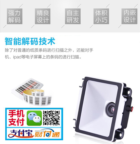 在日常使用的数据采集设备产品中,现已内嵌的扫描头(解码引擎)可以自动读取商品外包装上的条形码以及手机二维码(支付码),准确扫描条码信息,快速完成信息核对、商品支付、商品流转、商品管理与市场信息采集等所有环节;在各类自助终端机内部,先已内嵌的二维码扫描头可以更快更高效更精准的识别手机支付码,支持大范围广角扫描,无需刻意对焦;在各类闸机设备产品中,先已内嵌的门禁二维码读头可以自动扫描手机中的(动态)二维码通行证,准确核验身份信息...