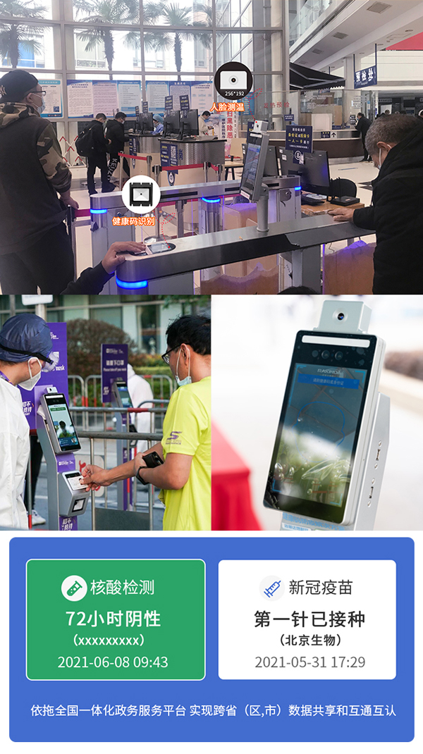 在甘肃某政务大厅内,一台形似柱式的人脸健康码识别设备正在恪尽职守地给每位通行人员进行着刷脸测体温核验健康码,绿码且体温正常时放行。工作人员称,这台健康码测温一体机就是市疫情防控指挥部官方指定的“F3-FHRS健康码人脸测温一体机”。该款“二码合一”健康码核验终端支持刷码/身份证核验健康码、核酸数据与测温功能,它采用“身份证+二维码”识别核验健康码的方式,刷身份证或刷健康通行二维码(地方码+国康码双码合一)立即读取健康码信息,并语音提示健康码颜色,绿码通行,黄码红码告警且禁止通行,方便了对红黄码、体温异常等风险人群进行管控与流调追溯,而且有效防止了人员聚集。目前F3系列健康码人脸测温一体机已对接国家政务平台健康码及15+地方码接口,包括陕西-渭南码/内蒙古-健康码/宁夏-健康码/湖南-健康码/贵州-健康码/河北-健康码/福建-八闽通健康码/四川-天府通/广东粤康码、甘肃等多个省市的健康码均已打通,极大地提高了防疫核验效率、解放人力。