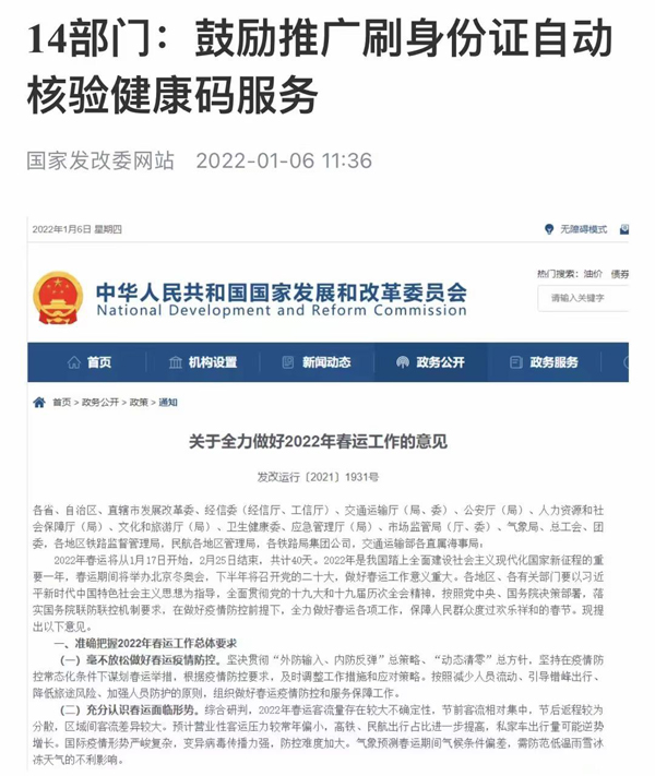 值得庆幸的是,1月6日,十四部门《意见》明确提到:春运防止“一刀切”和“层层加码”,落实健康码全国“一码通行”政策,鼓励各地区推广刷身份证自动核验健康码服务。如此一来,只需简单出示身份证,即可轻松完成对健康码的出示、核验,同步实现人、证、码“三合一”查验。