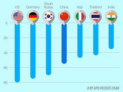 2015年世界各国非现金支付比例图
