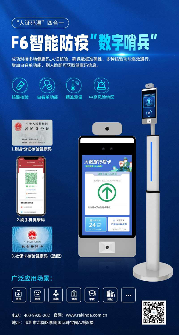 据上海发布消息,自2022年4月5日起,在全市推行“场所码”、“健康码核验一体机”(又称“数字哨兵”)扫码通行措施。到如今出入上海市各类重点场所将可能获得这样的防疫体验:凭二代身份证或上海随申码轻轻一刷,健康码状态、行程码、核酸结果检测和疫苗接种信息等防疫信息数据将在健康码防疫核验一体机的屏幕上显示出来并语音播报...近段时间,不少社区出入口管理升级迭代为健康码智能防疫终端设施,这些高科技产品的背后,很大一部分部署启用的健康码防疫核验一体机、高效便捷的智慧防疫解决方案以及技术平台均由深圳市远景达物联网技术有限公司提供技术支撑。