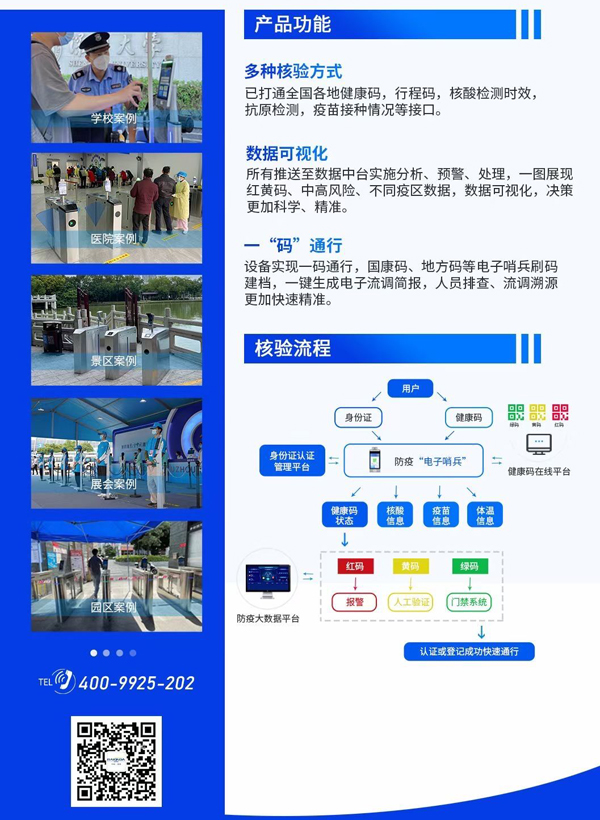 尽管,出入口通行处可以增加安保人力严控出行关,但对于人流量较大的入口来说,短时间内逐一检测体温,查验健康码、核酸检测情况以及疫苗接种情况等个人健康信息,不仅费时费力,效率也低,而且数据无法追溯、人员流调难。每当遇上人流量高峰时段往往容易造成人员拥堵,进而造成二次聚集,降低防控质量。此外,如果遇到没有智能手机或者不熟悉使用智能手机的老人、儿童,又或者网络信号差的时候,耗费的时间更久,入口拥堵程度可想而知。疫情防控常态化,这么下去不是长久之计,还是得技防。此情此景下,作为健康码精准防疫的技术保障方——深圳市远景达物联网技术有限公司积极响应政府号召,创新研发“电子哨兵”及测温核验健康码一体化防疫解决方案,以满足全国多地疫情防控工作的智能化、信息化服务需求,并在深圳、广州、上海、北京、江苏、福建等全国多个城市实现了规模化落地。