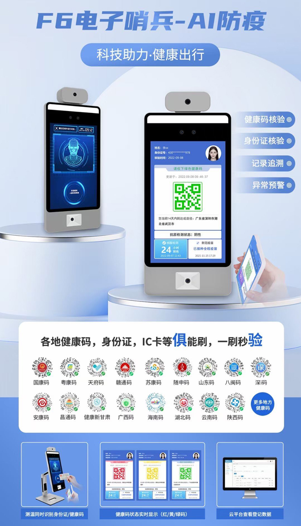 现在,全国很多政府机关单位、社区及园区入口、车站景区、医院、学校等公共室内室外场所相关设备已部署完毕,通过电子哨兵/F6健康码身份证核验一体机,可以实现自定义核酸时限管理方案,黄码红码报警提醒,中高风险地区行程报警提醒,结合闸机可自动拦截等功能,真正实现智能放防疫防控管理。