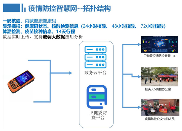 为解决卡口防疫工作,深圳市远景达物联网技术有限公司围绕如何能有效管理达到早发现疫情的目标,以卡口为疫情防控重点,部署白名单系统管理平台,平台与内蒙自治区防疫平台数据互联互通,统一管控人员数据、健康码防疫数据、设备数据。各卡口部署数字哨兵,支持内蒙健康码、身份证等多种方式通行,同时做好白名单核验,确保数据真实、精准防疫。信息安全加密汇聚后,物联网平台智能化分析支撑各级防疫部门;分析,流调,预警,决策,分解落实,科技助力抗疫。