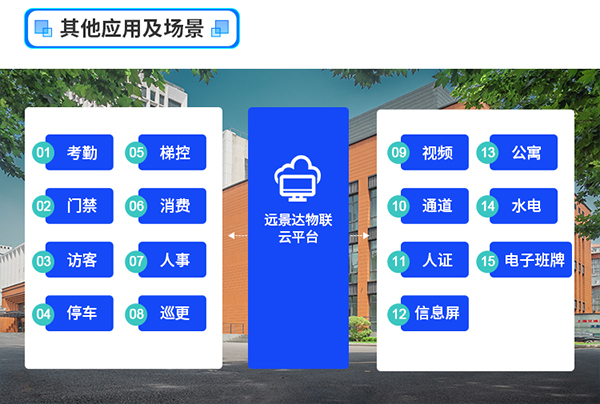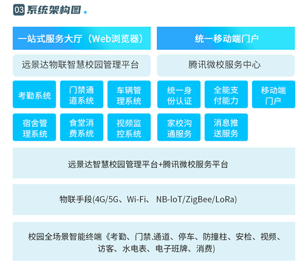 系统构架:远景达智慧校园管理平台+腾讯微校服务平台;校园全场景智能终端(考勤、门禁通道、停车、防撞柱、安检、视频、访客、水电表、电子班牌、消费)。