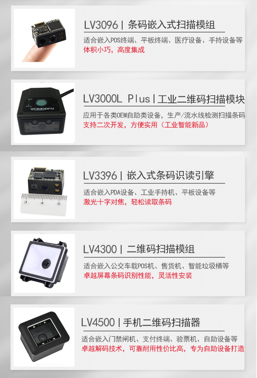(2)远景达(RAKINDA)LV3096/LV3296:可嵌入手持机扫描的二维码扫描模组,解码性能卓越,快速读取多种1D、2D条码,可靠耐用,无论怎样嵌入式应用总能面面俱到,无缝替换SE955,无需改模具;轻松解决日益普遍的纸面码和LCD、手机屏幕条码识别问题。