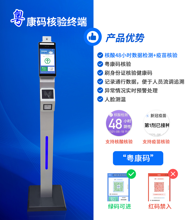 根据国家卫健委关于疫情常态化防控工作的要求,及广东省内各地最新的疫情防控针对性措施,在所有市辖区各类公共场所如果都设置粤康码人脸识别测温一体机(粤康码智能核验终端),可以持续为广东常态化疫情防控工作提供精准、有力支撑。进入防疫关口时通过刷身份证或扫手机粤康码即可自动核验与记录相应的通行数据,语音播报实时健康码信息、核酸48小时检测结果与疫苗核验等必查信息,异常情况实时预警处理,方便人员的流调追溯,为筑牢防疫屏障强有力的技术支持。