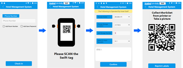详细说明:得到客户行李->在手持机内输入客户信息【电话号码,房间号,密码】->客户信息绑定吊牌->取吊牌(行李牌)并扫描吊牌上的二维码,绑定成功后并输入行李数量->将 QR 码显示给客户拍照或可按“打印”获取收据和行李贴纸、将贴纸贴在行李上->在其中一个绑上吊牌并存入仓库。