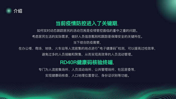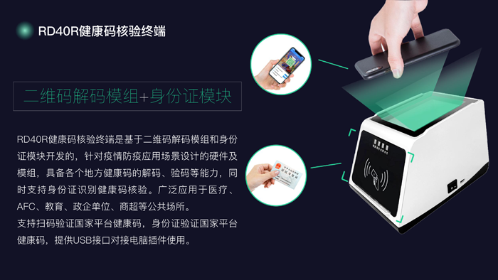 RD40R健康码核验终端是基于二维码解码模组和身份证模块开发的,针对疫情防疫应用场景设计的硬件及模组,具备各个地方健康码的解码、验码等能力,同时支持身份证识别健康码核验。广泛应用于医疗、AFC、教育、政企单位、商超等公共场所。