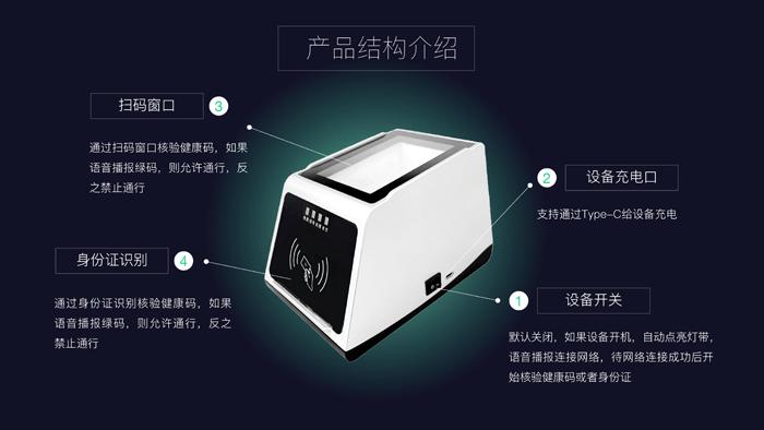 (1)设备开关:默认关闭,如果设备开机,自动点亮灯带,语音播报连接网络,待网络连接成功后开始核验健康码或者身份证;