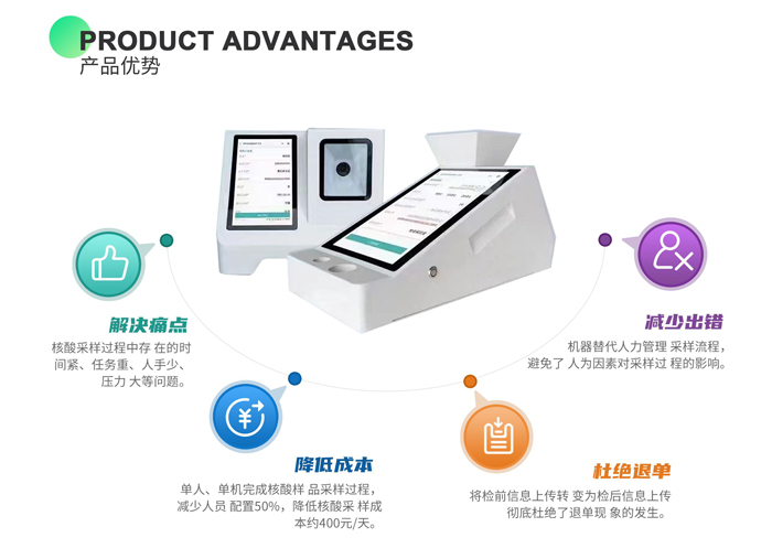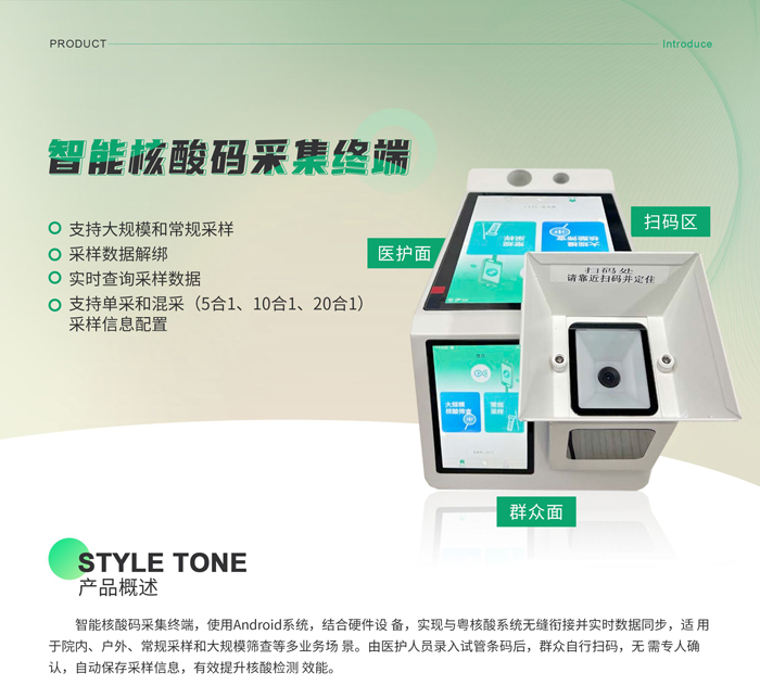 智能核酸码采集终端,使用Android系统,结合硬件设备,实现与核酸码系统无缝衔接并实时数据同步,适用于院内、户外、常规采样和大规模筛查等多业务场景。由医护人员录入试管条码后,群众自行扫码,无需专人确认,自动保存采样信息,有效提升核酸检测效能。