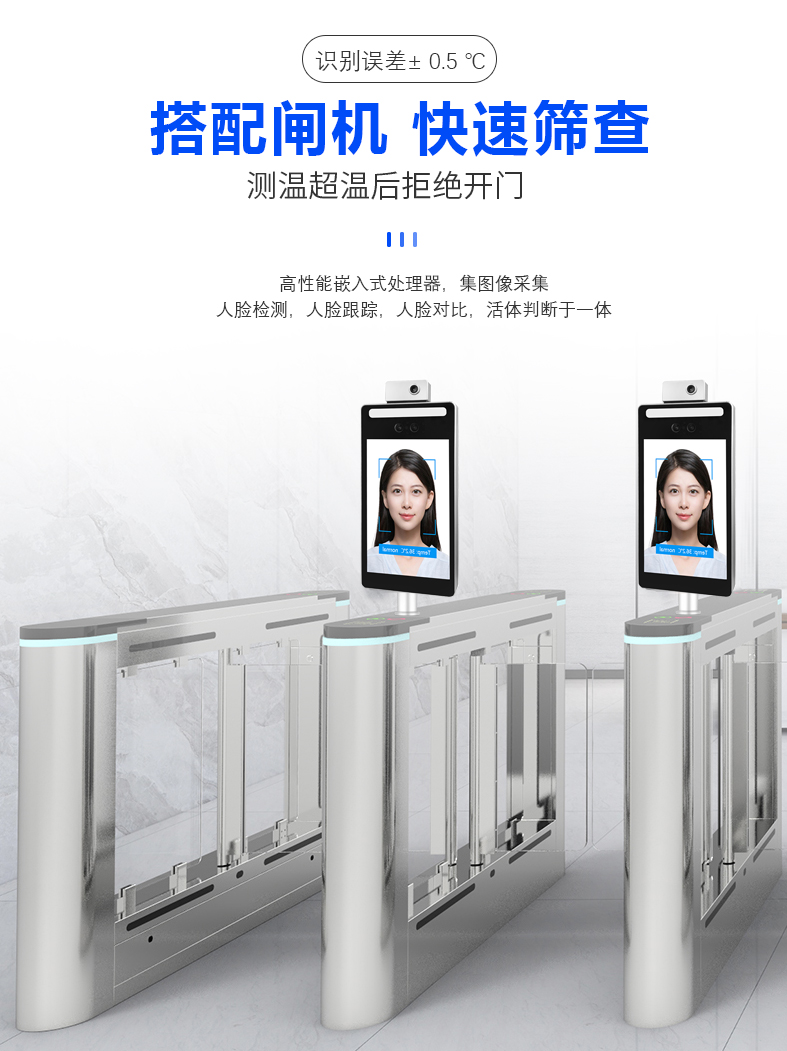 F2-TH(闸机款)人脸识别测温门禁一体机,可通过内置的红外测温模块实现体温快速检测,可同时支持人脸比对、体温检测、口罩检测等功能,并对体温异常人员进行预警,能够有效的保障防控安全。