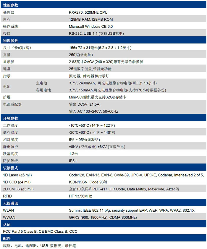 人体工学设计,操作简单,有效降低疲劳感及重复性伤害;外形美观,体积小巧,便于携带;符合IP54防护等级和1.2米跌落,有效的保证了在较为恶劣的应用环境下持续工作。1D 激光、1D CCD、2D 图像、RFID及电力红外抄表等多种采集方式可选、易于满足用户的各种需求。拥有WIFI及GPRS无线传输功能,方便用户及时的捕获和交换数据。