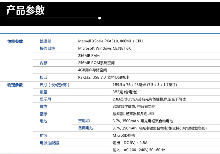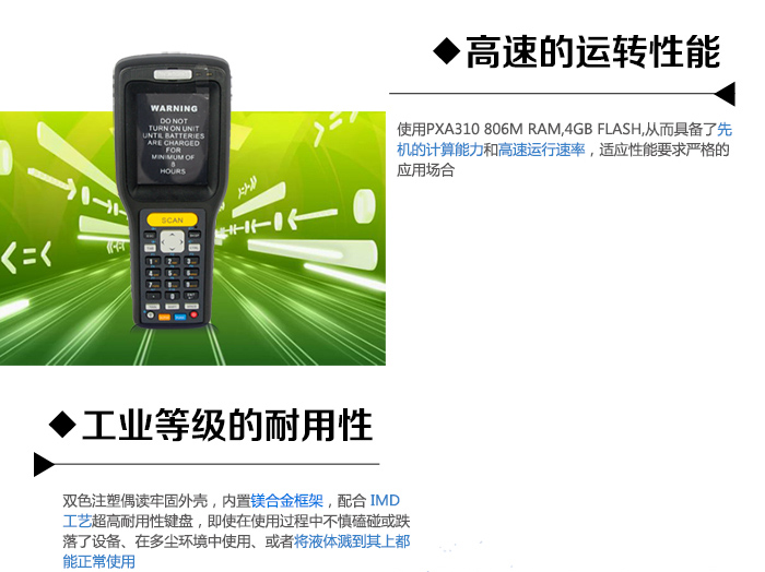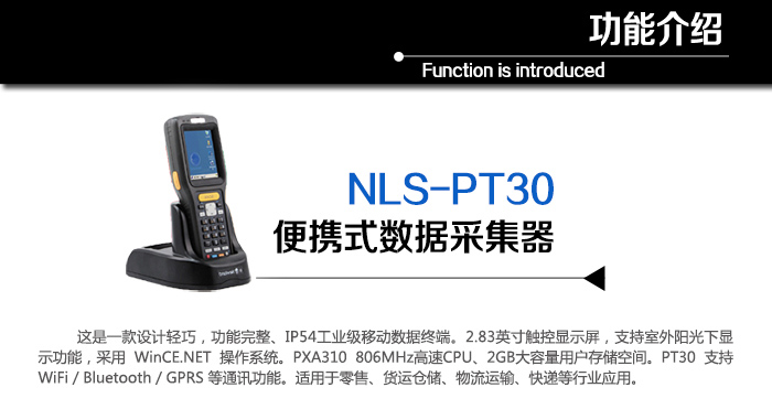 NLS-PT30便携式(条码)数据采集器设计轻巧、功能多样,具备IP54工业防护等级。预装Microsoft Windows CE.NET 6.0中文版操作系统,配备Marvell XScale PXA310 806MHz高速CPU、4GB大容量存储空间及2.83英寸阳光下可读触控显示屏,支持WiFi/Bluetooth/GPRS/WCDMA 等通讯 方式,适用于超市、物流、停车、快递、库存管理、医疗卫生等应用场景。