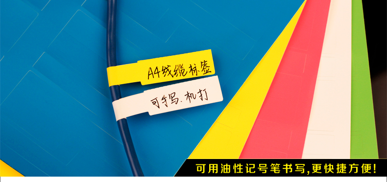 线缆标签,胶层薄,不溢胶,保存时间久,对环境温度要求较低,无论高温低温,粘性都很稳定。还可用油性记号笔书写,更快捷方便,且字迹清晰,色彩亮丽,在布线繁杂的配线架上,使用旗帜型线缆标签,就算在较远距离也可获得良好的可读性。目前,此类线缆标签广泛用于机房线路的铺设以及家庭区分线路使用。