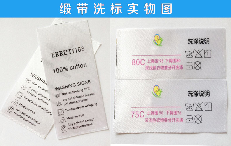 洗水唛/水洗标/水洗布广泛适用于服装、鞋帽、家纺、包装、物流等行业的商标标签。