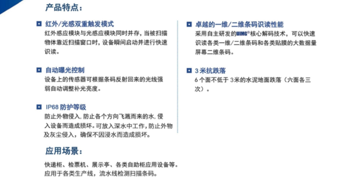 采用自主研发的UIMG核心解码技术,可快速识读各类一维/二维条码和各类贴膜的大数据量屏幕二维条码。