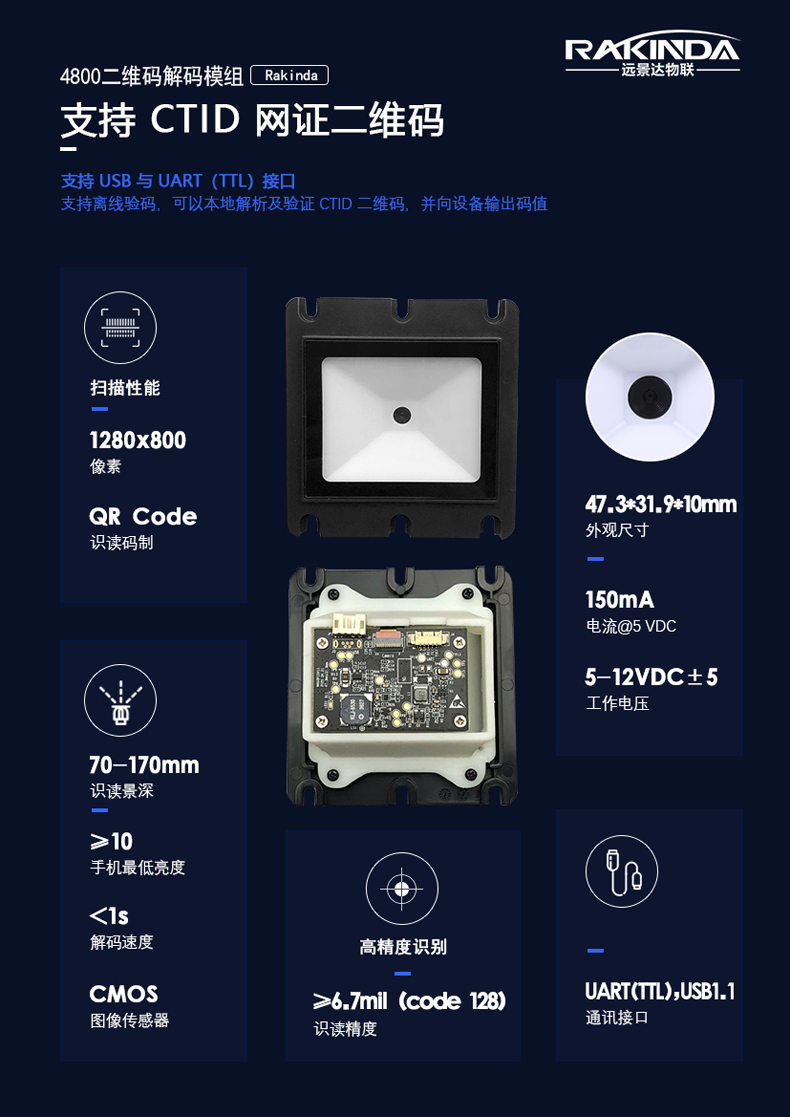 4800 模组是基于远景达CTID 二维码解码模组开发的,针对网证CTID的各种应用场景设计的硬件级模组,可用于识别验证国家防疫健康码,具备网证CTID的解码、验码等能力。