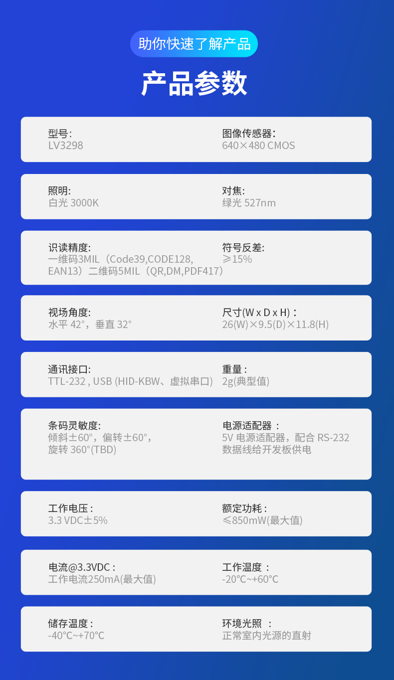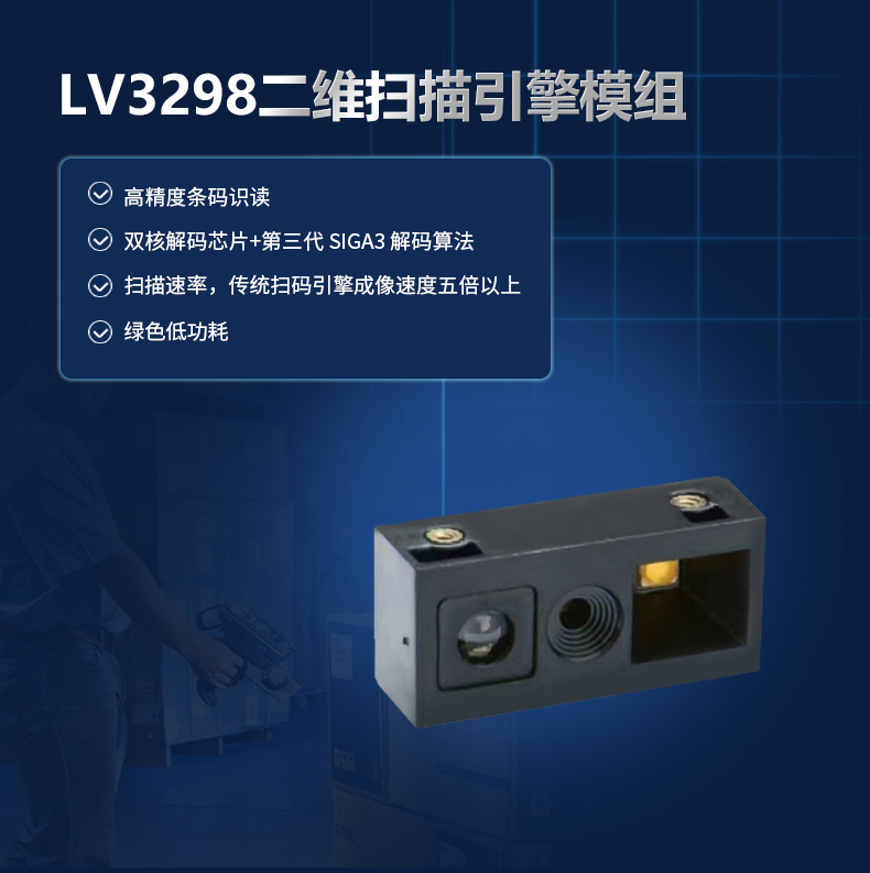 LV3298是一款高性能嵌入式二维影像模组。该系列二维条码扫描模块采用先进的双核解码芯片+第三代SIGA3解码算法,具有高精度条码识读性能,扫描速率高,同时它的二维成像速度是传统扫码引擎成像速度五倍以上,可以轻松读取纸质条码及显示屏上的二维码,一体化紧凑型设计可方便嵌入到各类设备中。