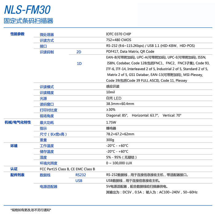 FM30是一款嵌入式一维/二维扫描模块。该系列的条码扫描模组采用了卓越的CMOS影像技术以及国际领先的智能图像识别系统。该产品识读性能强大,可以快速读取手机屏幕和纸质文档上的条码信息;支持二次开发,支持支付宝、微信支付一维、二维付款条码的读取,即使在手机电量不足、手机屏幕贴膜、彩色条码等情况下也能轻松读取条码。主要应用于电子凭证、移动营销、办公自动化等领域。