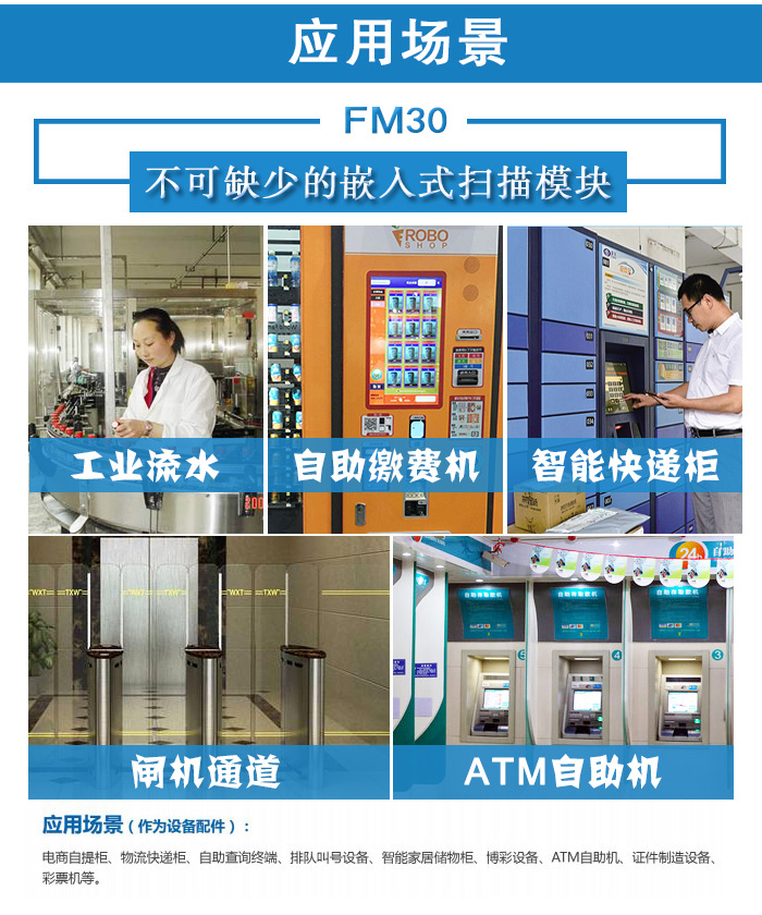 1、FM30二维扫描模块嵌入通道闸机/验票终端,用于支持屏幕、纸质票券码的识读应用,并拓展手机“刷码过闸”功能