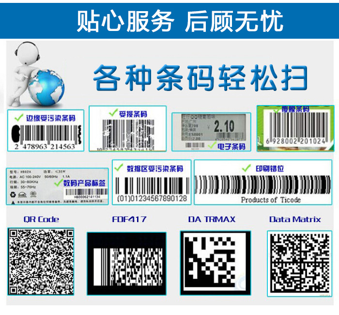 印刷在纸张上的主要二维条码和各种一维条码也能被识读。