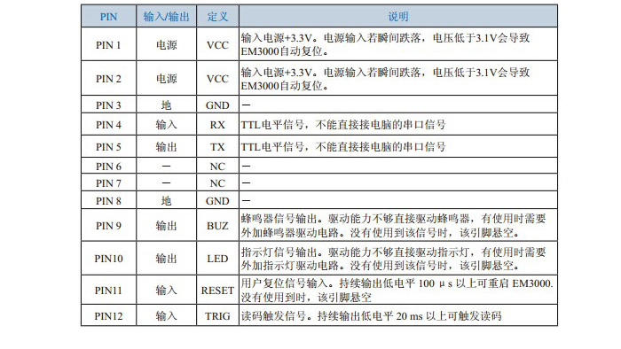 *标准EM3000不支持MicroPDF417条码和OCR,定制性产品支持 **测试条件如下: Code39,3 Bytes;最小条空宽度 = 10mil;宽窄比 = 3:1;PCS = 0.8;条码高度 = 11mm;测试距离 = 120mm;环境温度=23℃;环境照度= 200 lux |
