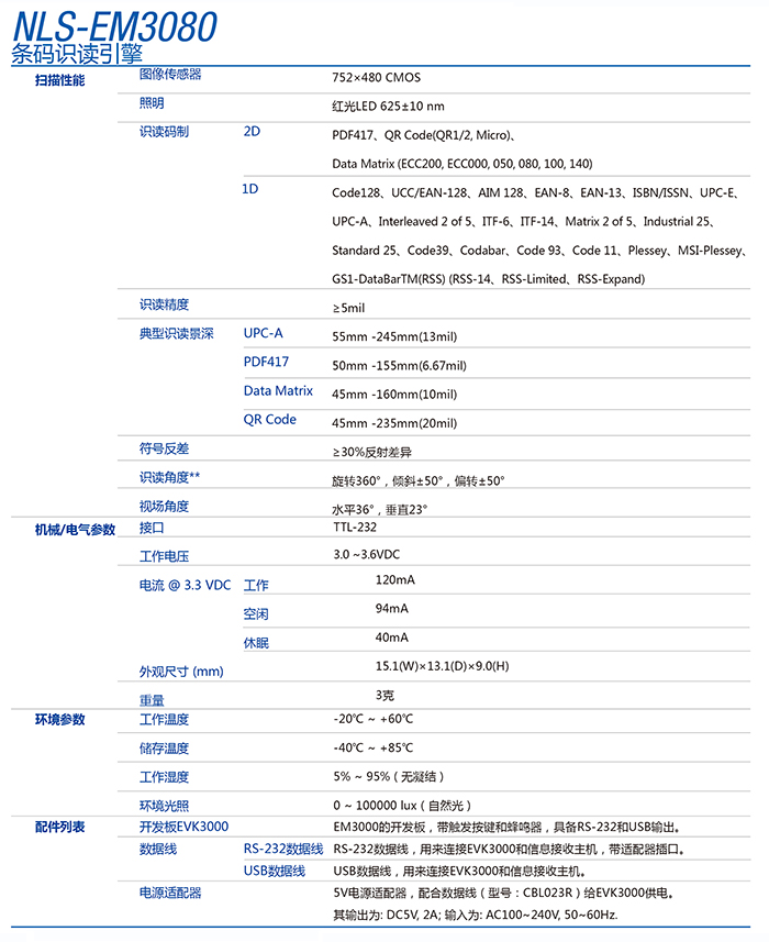 EM3080可识读各类主流一维条码、PDF417、QR Code(QR1、QR2、Micro QR)和Data Matrix的各种版本,还支持识读GS1-DataBarTM(RSS)条码,包括RSS-Limited、RSS-14、RSS-14 Stacked、RSS-Expand等版本。