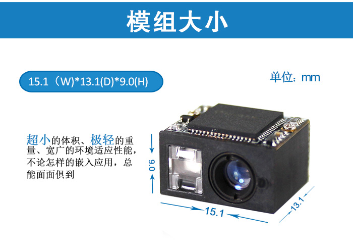 小巧的设计,可嵌入于绝大多数的设备,仅仅3克的重量,几乎感觉不到它的存在。的瞬间启动功能,可允许在应用中彻底关断电流,在需要时瞬间启动进行条码识别,并以超低的工作功耗为应用带来便利和迅捷。