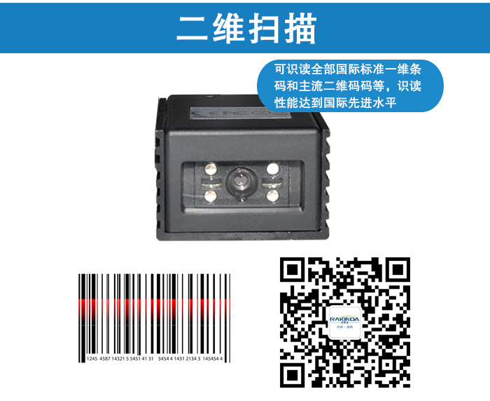 该扫描器,采用自主的UIMG®核心技术,完全由本公司独立设计制造。包含光学系统、光电耦合系统、图形数字化、编解码、图形处理、嵌入式系统等一系列综合性技术,可识读全部国际标准一维条码和主流二维码(QR Code、Data Matrix、PDF 417、Aztec、Maxicode、汉信码等),识读性能达到国际先进水平。