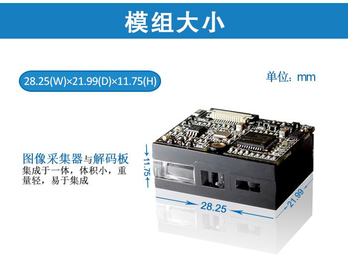 ◆高集成度:图像采集器与解码板集成于一体,体积小,重量轻,易于集成。