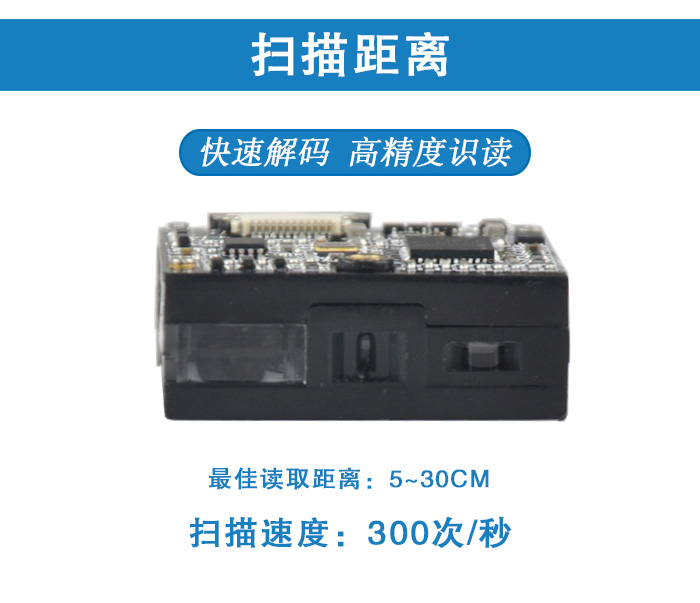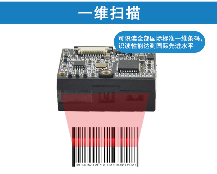 该扫描模块采用自主的核心技术,包含光学系统、光电耦合系统、图形数字化、编解码、图形处理、嵌入式系统等一系列综合性技术。可识读全部国际标准一维条码,识读性能达到国际先进水平。