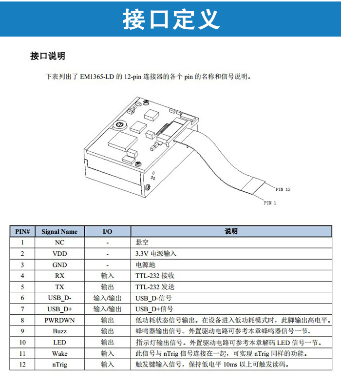 EM1365-LD微型条码扫描模块,条形码扫描模组将图像采集器与解码板集成于一体,体积小、重量轻,可方便嵌入各种设备作为条码的识读组件应用,如展示亭、检票机、PDA等。
