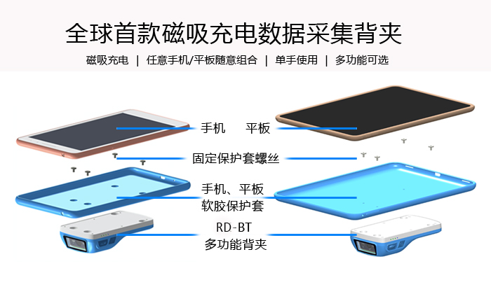 RD-BT,全球首款磁吸充电数据采集背夹,让手机/平板“秒”变专业信息化终端,推动政企行业移动信息化大普及。适用场景:移动护理、快递物流、仓储、门店、二维码支付、生产管理、电力抄表等。